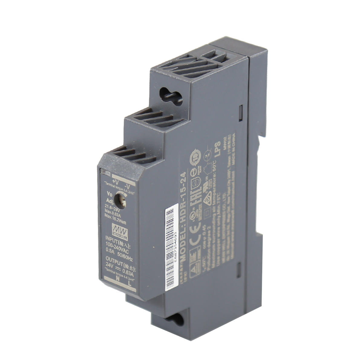 The HDR-15 DIN rail power supply series provides a 15 Watt solution. It can be installed on DIN rail TS-35/7.5 or 15. Standard protections include short circuit, overload, over voltage, and over temp protection. LED indicators are provided for power on.Features