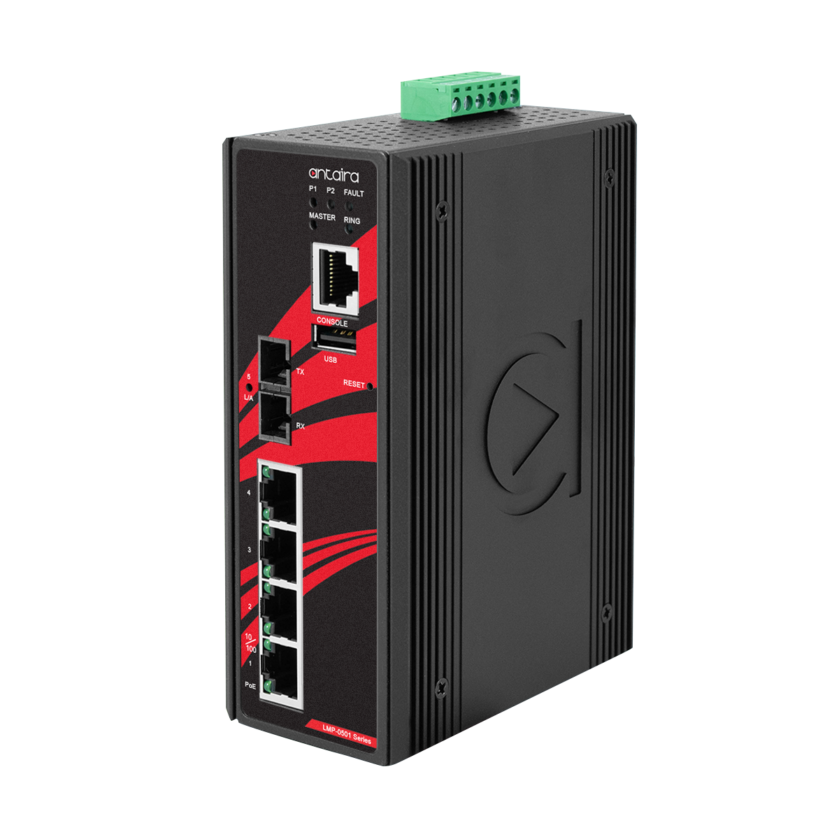 Antaira’s LMP-0501-24 series is a 5-port industrial PoE+ Light Layer 3 managed Ethernet switch that is embedded with 4*10/100Tx Ethernet ports that support IEEE802.3at/af for a maximum of 30 watts per port, and 1*100Fx (SC or ST connector) fiber port with optional versions for multi-mode (2Km) and single-mode (30Km).LMP-0501 series is a fully manageable industrial Ethernet switch with a pre-loaded Light Layer 3 network management web console that supports a low voltage redundant power input range from 12~36VDC with a voltage booster. This product series is IP30 rated, DIN-rail mountable, and has two wide operating temperature models for either a standard temperature range ( STD: -10°C to 70°C) or an extended temperature range (EOT: -40°C to 75°C). It also provides high EFT and ESD protection for any industrial networking application within factory automation, ITS, power/utility, water wastewater, and any other outdoor or harsh environment.Features