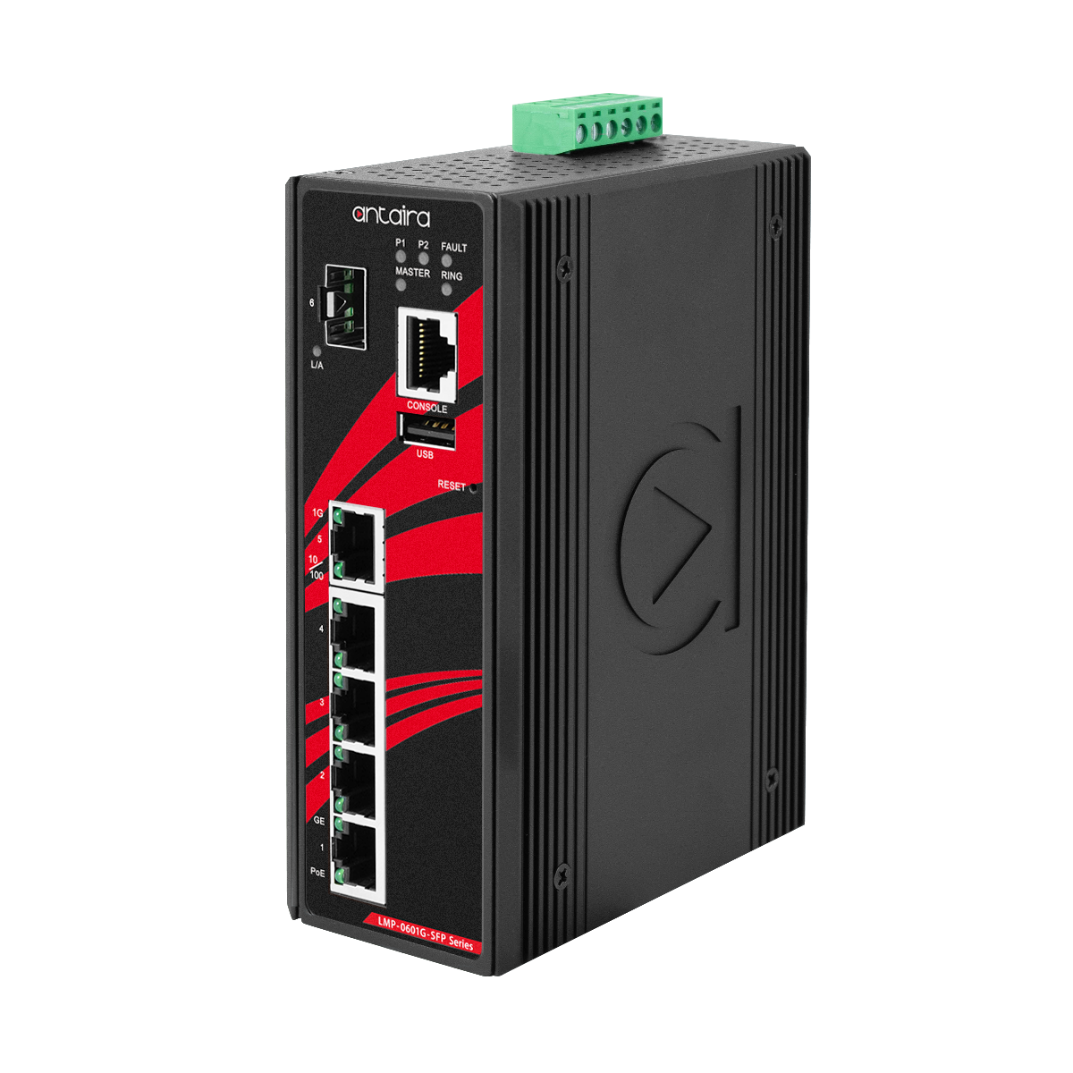 Antaira Technologies’ LMP-0601G-SFP-24-T-V2 is a 6-port industrial gigabit PoE+ managed Ethernet switch embedded with 4*10/100Tx Ethernet ports that support IEEE802.3af/at for a maximum of 30W/port and 1*100/1000 SFP port. The LMP-0601G-SFP-24-T-V2 is a fully manageable light layer 3 Ethernet switch that is pre-loaded with a user-friendly web management console design. It supports the ring network redundancy function using the market’s open standard ITU-T G.8032 Ethernet Ring Protection Switch (ERPS) protocol that has a <50ms network recovery time. The advanced network filtering and security functions, such as IGMP, VLAN, QoS, SNMP, RMON, Modbus TCP, and 802.1X/HTTPS/SSH/SSL increase determinism and improve network management for remote SCADA systems or control networks.The LMP-0601G-SFP-24-T-V2 is IP30 rated and DIN-rail mountable. There are also an extended temperature range (EOT: -40°C to 75°C). It also provides high EFT and ESD protection for industrial networking applications, such as power/utility, water wastewater, oil/gas/mining, factory automation, security surveillance, ITS and any other outdoor or harsh environment.Version 2 hardware is compatible with the latest Light Layer 3 firmware which permits static routes between VLANs.Features