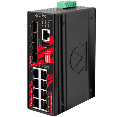 Antaira Technologies’ LMP-1204G-SFP-bt-24-T is a 12-port industrial Gigabit PoE++ managed Ethernet switch embedded with 4*10/100/1000Tx Ethernet ports that support IEEE 802.3bt for a maximum of 90W/port, 4*10/100/1000Tx Ethernet ports with IEEE 802.3af/at support for a maximum of 30W/Port, and 4*100/1000 dual rate SFP slots for fiber connection. The LMP-1204G-SFP-bt-24-T is a fully manageable Light Layer 3 Ethernet switch that is pre-loaded with a user-friendly web management console design. It supports the ring network redundancy function using the market’s open standard ITU-T G.8032 Ethernet Ring Protection Switch (ERPS) protocol that has a <50ms network recovery time. The advanced network filtering and security functions, such as IGMP, VLAN, QoS, SNMP, RMON, Modbus TCP, and 802.1X/HTTPS/SSH/SSL increase determinism and improve network management for remote SCADA systems or control networks.The LMP-1204G-SFP-bt-24-T is IP30 rated and DIN-rail mountable. There are also an extended temperature range (EOT: -40°C to 75°C). It also provides high EFT and ESD protection for industrial networking applications, such as power/utility, water wastewater, oil/gas/mining, factory automation, security surveillance, ITS and any other outdoor or harsh environment.Features