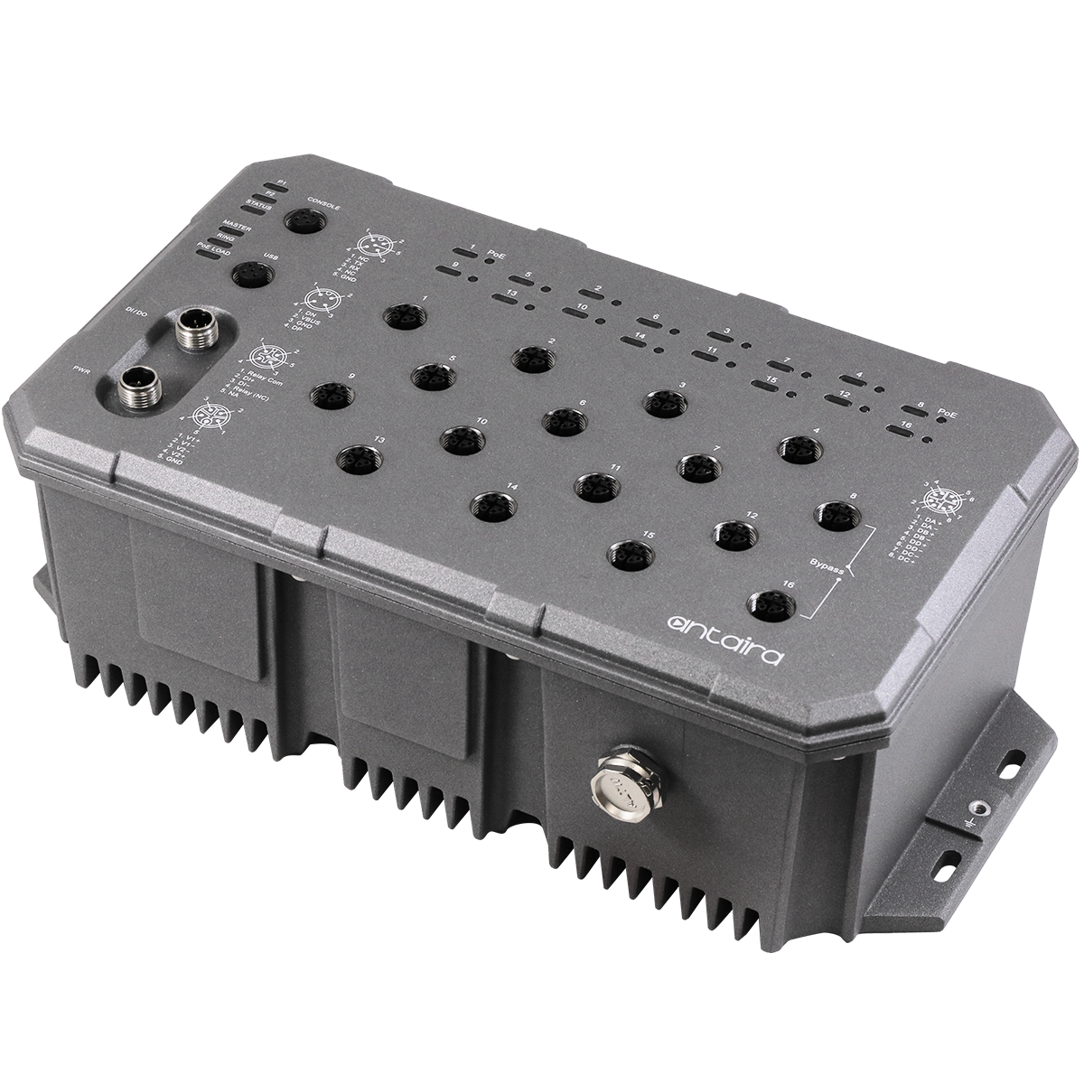 - Dual DC power inputs through M12 5-pin K-coded male connector