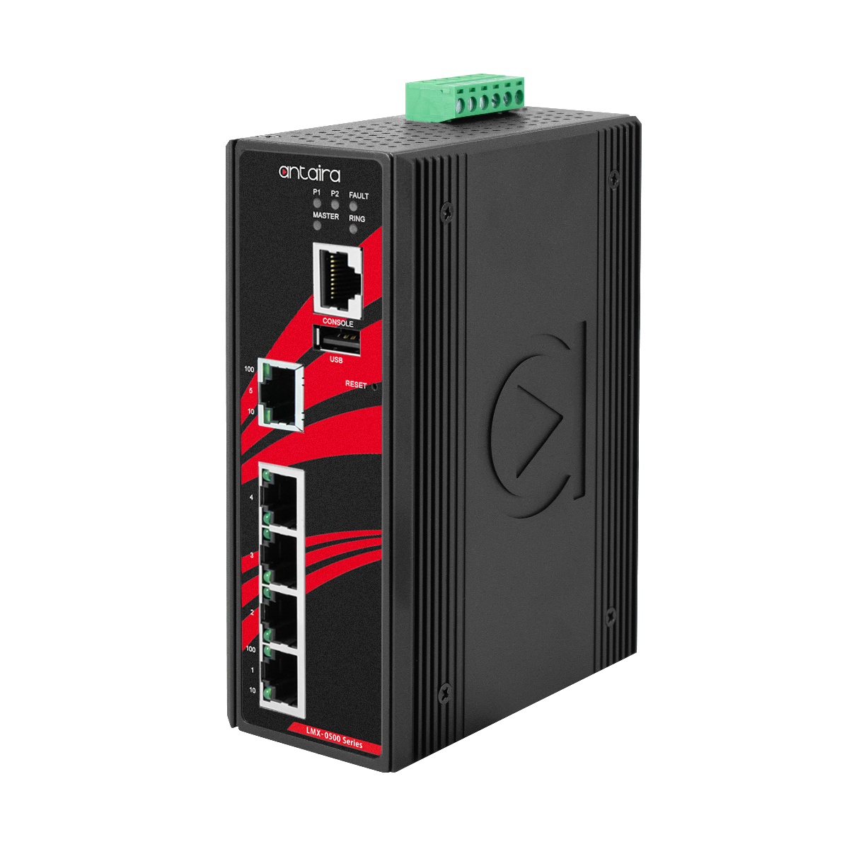 Antaira LMX-0500-V2 series is a 5-port industrial managed Ethernet switch that is embedded with 5*10/100Tx fast Ethernet ports. This series is a fully manageable industrial Ethernet switch pre-loaded with standard Layer 2 network management software, and supports a user friendly web console interface for easy configuration.The LMX-0500-V2 series is IP30 rated, DIN-rail mountable, and has two wide operating temperature models for either a standard temperature range ( STD: -10°C to 70°C) or an extended temperature range (EOT: -40°C to 75°C). It also provides high EFT and ESD protection for any industrial networking application within factory automation, ITS, power/utility, water wastewater, and any other outdoor or harsh environment.Version 2 hardware is compatible with the latest layer 2+ firmware which permits static routes between VLANsFeatures