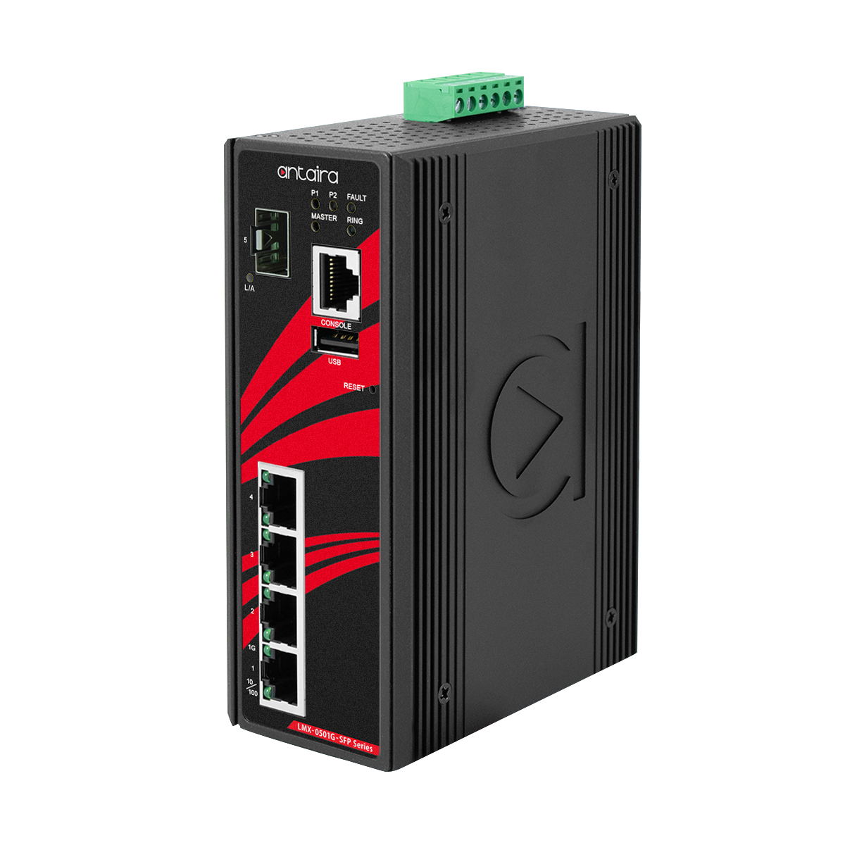 LMX-0501G-SFP-T-V2 | 5-Port Industrial Gigabit Light Layer 3 Managed Ethernet Switch | w/4*10/100/1000Tx + 1*100/1000 SFP Slot; EOT -40~75C | Antaira