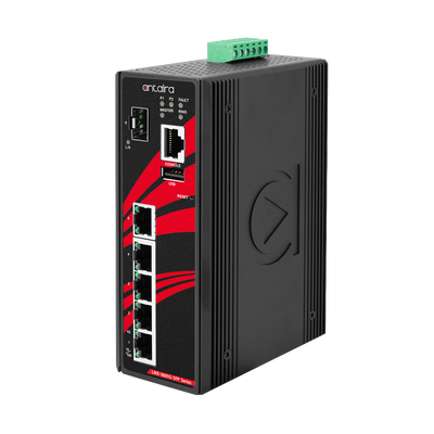 Antaira’s LMX-0601G-SFP-V2 is a 6-port industrial Gigabit managed Ethernet switch that is embedded with five gigabit Ethernet ports and one dual rate (100/1000) SFP slots for fiber connection. This switch is a fully manageable industrial Ethernet switch pre-loaded with light layer 3 network management software, and supports a user friendly web console interface for easy configuration.The LMX-0601G-SFP-V2 is IP30 rated, DIN-rail mountable, and has an operating temperature model for a standard temperature range (STD: -10°C to 70°C). It also provides high EFT and ESD protection for any industrial networking application within factory automation, ITS, power/utility, water wastewater, and any other outdoor or harsh environment.Version 2 hardware is compatible with the latest light layer 3 firmware which permits static routes between VLANsFeatures
