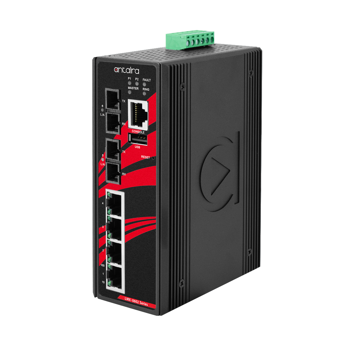 Antaira’s LMX-0602-M is a 6-port industrial managed Ethernet switch that is embedded with 4*10/100Tx fast Ethernet ports and 2*100Fx SC fiber connectors with multi-mode 2Km support. It is a light layer 3 manageable Ethernet switch pre-loaded with user friendly web management console design. It supports Ring Network Redundancy function with market open standard ITU-T G.8032 ERPS (Ethernet Ring Protection Switch) protocol <50ms network recovery time. The advanced network Filtering and Security functions, IGMP, VLAN, QoS, SNMP, RMON, ModbusTCP, and 802.1X/HTTPS/SSH/SSL increase determinism and improve network management for remote SCADA systems or control network.The LMX-0602-M is a high performance industrial managed Ethernet switch with a compact size, IP30 rating, DIN-rail or wall mounting design, and standard operating temperature range from -10°C to 70°C. It provides high EFT and ESD protection for any industrial networking applications within Power/Utility, Water Wastewater, Oil/Gas/Mining, Factory Automation, ITS-Transportation, Security Surveillance and any other outdoor or harsh environment.Version 2 hardware is compatible with the latest light layer 3 firmware which permits static routes between VLANs.Features