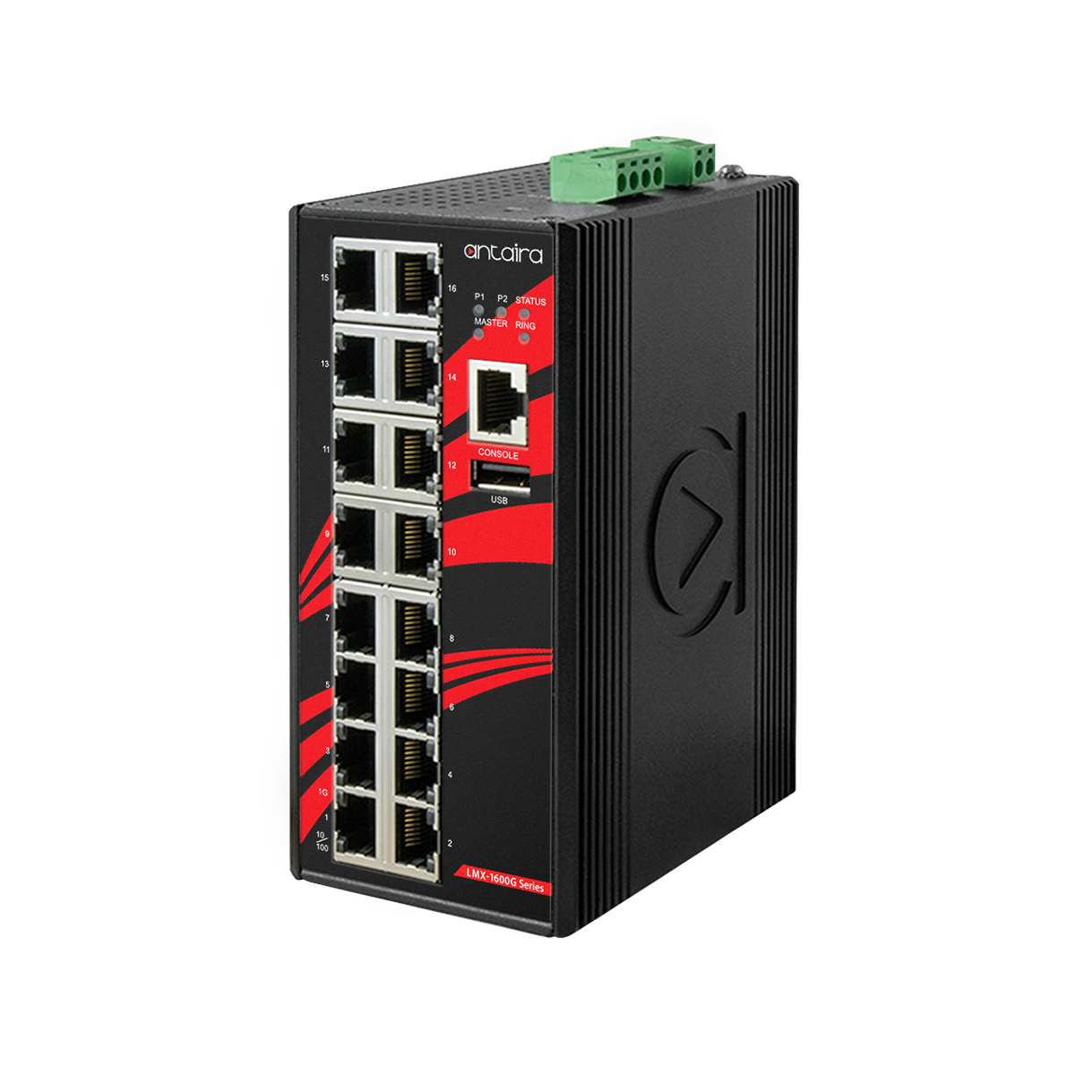 Antaira Technologies’ LMX-1600G is a 16-port industrial Gigabit managed Ethernet switch that is embedded with 16*10/100/1000Tx Ethernet ports. The LMX-1600G is a fully manageable light layer 3 Ethernet switch that is pre-loaded with a user-friendly web management console design. It supports the ring network redundancy function using the market’s open standard ITU-T G.8032 ERPS (Ethernet Ring Protection Switch) protocol that has a <50ms network recovery time. The advanced network filtering and security functions, such as, IGMP, VLAN, QoS, SNMP, port lock, RMON, Modbus TCP, and 802.1X/HTTPS/SSH/SSL increase determinism and improve network management for remote SCADA systems or control networks.The LMX-1600G is IP30 rated and DIN-rail mountable. There are also a operating temperature model for a standard temperature range (STD: -10°C to 70°C). It also provides high EFT and ESD protection for industrial networking applications, such as, power/utility, water wastewater, oil/gas/mining, factory automation, security surveillance within transportation, ITS and any other outdoor or harsh environment.Features