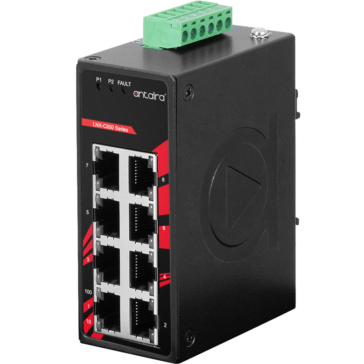 Antaira Technologies’ LNX-C800 series is a compact 8-port industrial Ethernet switch . The small form factor of this metal IP30 rated industrial switch is 30% smaller allowing for a more versatile implementation. The LNX-C800 series is equipped with 8*10/100Tx RJ45 Ethernet ports. The industrial-grade design and compact size of the LNX-C800 series make this the ideal unit for integration into projects or other applications that need a small footprint.The LNX-C800 industrial switch series supports reverse polarity and overload current protection. This industrial switch series supports DIN-rail as well as wall-mountable orientations and provides standard operating temperature range models in -10°C to 65°C. This is an industrial-grade unit applicable for networking applications in factory automation, ITS, power/utility, water wastewater treatment plants, or any application that needs a compact solution.Features