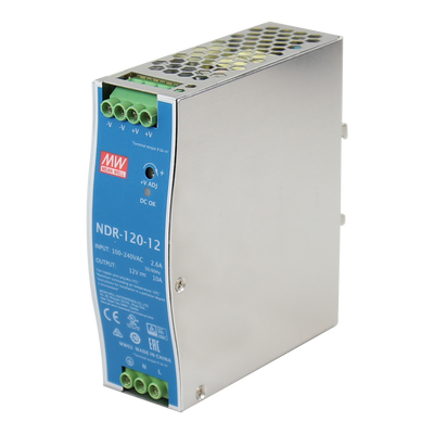 The NDR-120 DIN rail power supply series provides a 120 Watt solution. It can be installed on DIN rail TS-35/7.5 or 15. UL508 listed (for industrial equipment). Standard protections include short circuit, overload, over voltage, and over temp protection. LED indicators are provided for power on.Features
