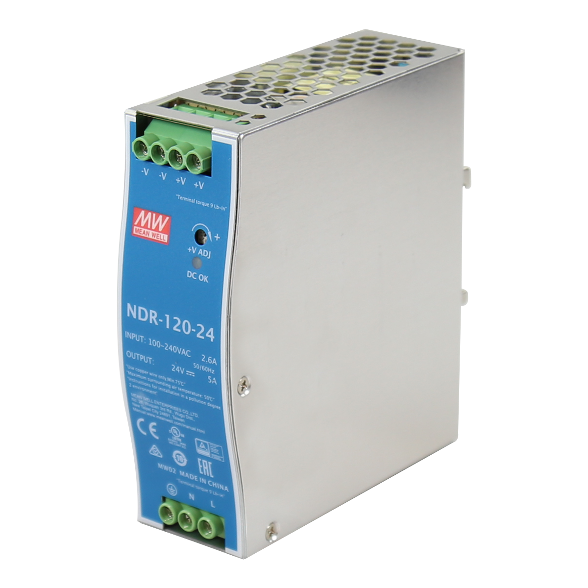 The NDR-120 DIN rail power supply series provides a 120 Watt solution. It can be installed on DIN rail TS-35/7.5 or 15. UL508 listed (for industrial equipment). Standard protections include short circuit, overload, over voltage, and over temp protection. LED indicators are provided for power on.Features