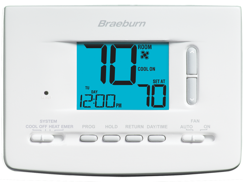 The digital programmable thermostat shall be a Braeburn®, model number 2220, 3.70” high x 5.16” wide x 1.38” deep, powered independently with either 24 Volt AC or with two “AA” alkaline batteries (3.0 Volt DC). The thermostat shall be compatible with multi-stage conventional systems up to two stages of heating and two stages of cooling or heat pump systems with up to two stages of heating and one stage of cooling. The thermostat shall have a bright blue backlight display and separate sub-base for trouble free installation. Temperature control range shall be between 45° and 90° F (7° and 32° C), accuracy of +/- 1° F (+/- .5° C), humidity range between 5% and 95% relative humidity. The thermostat shall include non-volatile memory to retain user settings, adjustable temperature limits, filter check monitor, adaptive recovery mode (ARM™), separate heating and cooling set point program times and temperatures, and auxiliary heat indicator. Thermostat shall have low battery indication and a front reset button will return user settings to default values when pressed. The thermostat can be mounted to a horizontal junction box. Meets Energy Aware® Guidelines.