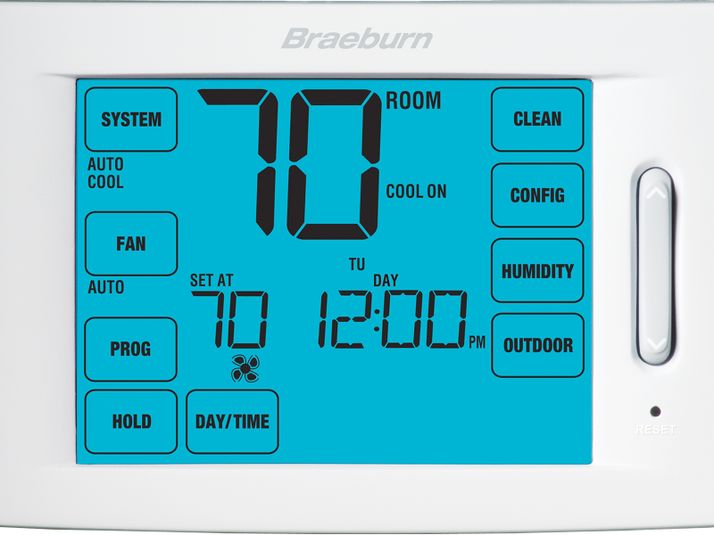 The universal auto changeover thermostat shall be a Braeburn® model number 6300, 4.13” high x 6.13” wide x 1.38” deep, powered with either 24 Volt AC or with two “AA” Alkaline batteries (3.0 Volt DC). In the event of a power failure, the unit shall retain all user, installer and program settings. The thermostat shall be compatible with low voltage single stage or multi-stage gas, oil, or electric conventional heating or cooling systems with up to three stages of heating and two stages of cooling, and heat pump systems with up to four stages of heating and two stages of cooling. Also compatible with 250mv – 750mv millivolt heating only systems. The thermostat shall have a bright blue backlight display, touchscreen with SpeedBar®, separate sub-base and multi-level keypad lockout. Temperature control range shall be between 45° and 90° F (7° and 32° C), accuracy of +/- 1° F (+/- .5° C). Operating humidity range between 5% and 95% relative humidity. The thermostat shall include separate installer and user setup modes, residential or commercial setup modes, permanent non-volatile memory to retain user settings, filter, UV and humidifier pad check monitor, adaptive recovery mode (ARM™), programmable independent fan control, residual cooling fan delay, indoor or outdoor remote sensor capability, auxiliary heat fossil fuel programming, and compressor power outage protection. A front reset button will return user settings to default values when pressed. Meets IECC 2012 and Energy Aware® Guidelines.
