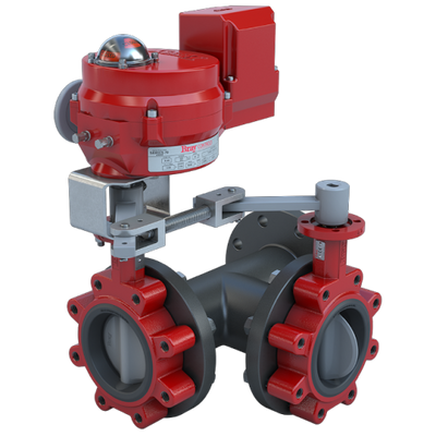 Butterfly Valve | 3 Way | Flow Configuration 4 | 4 Inch | Nylon Coated Disc | 50 PSI | 24 VAC /30 VDC Actuator With Heater And Battery Backup Failsafe Return | Modulating Control