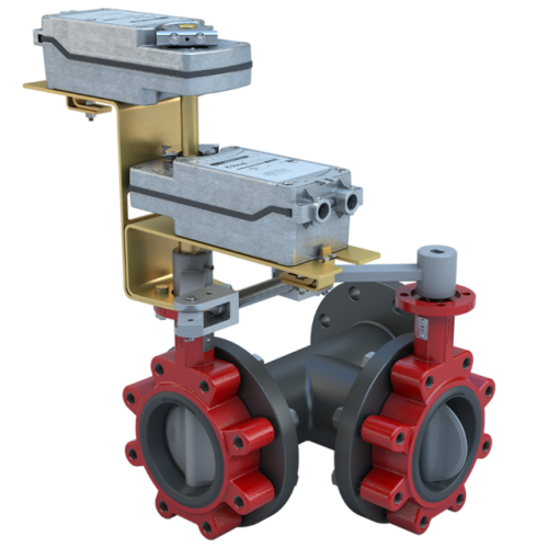 Butterfly Valve | 3 Way | Flow Configuration 3 | 4 Inch | Nylon Coated Disc | 175 PSI | DUAL Mounted 24 VAC/DC Spring Return Actuators | Modulating Control