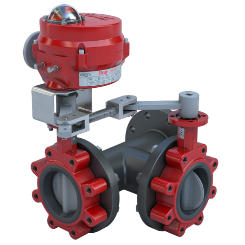 Butterfly Valve | 3 Way | Flow Configuration 6 | 4 Inch | Nylon Coated Disc | 175 PSI | 120 VAC Non-Spring Return Actuator With Heater | Modulating Control
