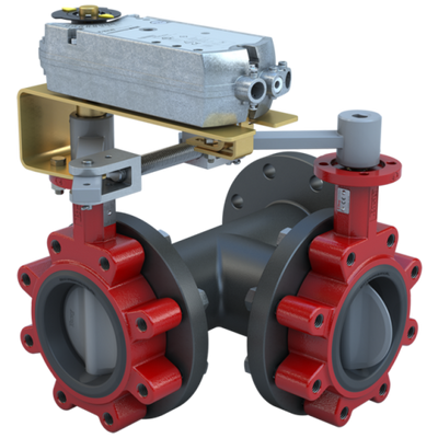 Butterfly Valve | 3 Way | Flow Configuration 2 | 5 Inch | Nylon Coated Disc | 50 PSI | 24 VAC Non-Spring Return Actuator | Modulating Control