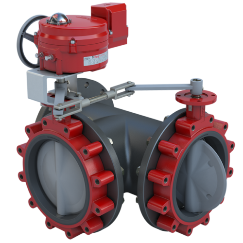 Butterfly Valve | 3 Way | Flow Configuration 5 | 12 Inch | Nylon Coated Disc | 50 PSI | 24 VAC /30 VDC Actuator With Heater And Battery Backup Failsafe Return | Modulating Control