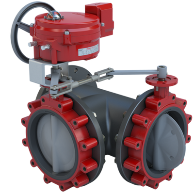 Butterfly Valve | 3 Way | Flow Configuration 9 | 14 Inch | Nylon Coated Disc | 50 PSI | 24 VAC /30 VDC Actuator With Heater And Battery Backup Failsafe Return | Modulating Control
