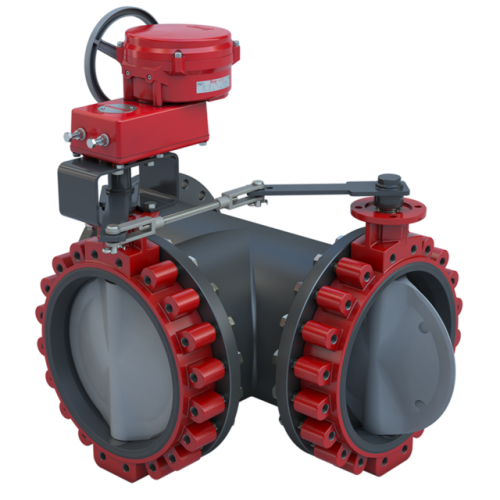 Butterfly Valve | 3 Way | Flow Configuration 6 | 18 Inch | Nylon Coated Disc | 150 PSI | 120 VAC Non-Spring Return Actuator With Heater | On-Off Control