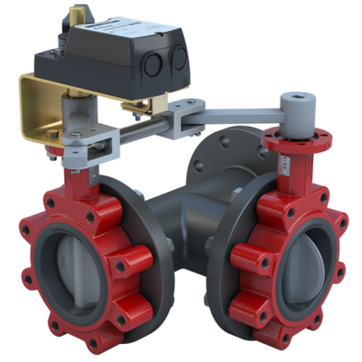 Butterfly Valve | 3 Way | Flow Configuration 8 | 2.5 Inch | Nylon Coated Disc | 175 PSI | 24 VAC/DC Non-Spring Return Actuator | On-Off And Floating Control