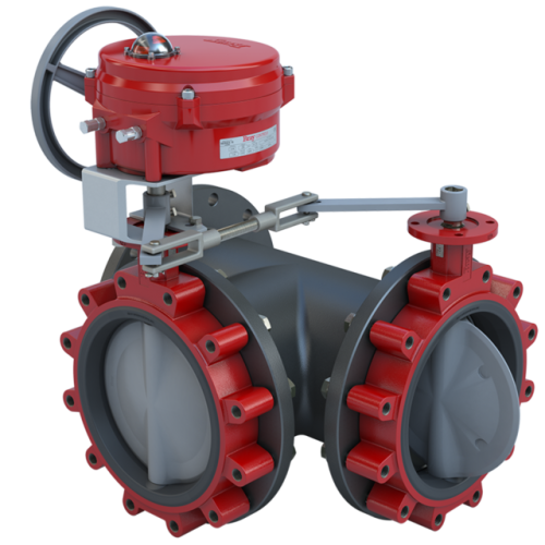 Butterfly Valve | 3 Way | Flow Configuration 4 | 14 Inch | Stainless Disc | 150 PSI | 120 VAC Non-Spring Return Actuator With Heater | On-Off Control