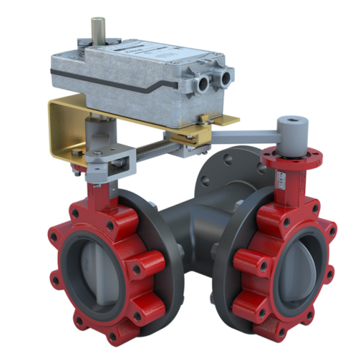 Butterfly Valve | 3 Way | Flow Configuration 10 | 2.5 Inch | Stainless Disc | 175 PSI | 24 VAC/DC Spring Return Actuator | On-Off Control