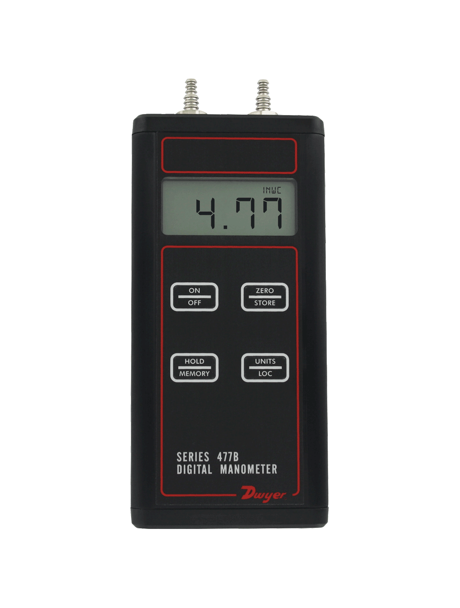 The Series 477B Handheld Digital Manometers are versatile, hand-held, battery operated manometers available in several basic ranges from 0-20 in w.c. up to 100 psi. All models measure either positive, negative or differential pressures with ±0.10% of full scale accuracy. You can select from up to seven common English and metric pressure units so conversions are not necessary. A memory function allows storage of up to 40 readings for later recall and a backlight provides auxiliary lighting for hard-to-see locations. Also standard are a hold feature plus both visual and audible overpressure alarms.