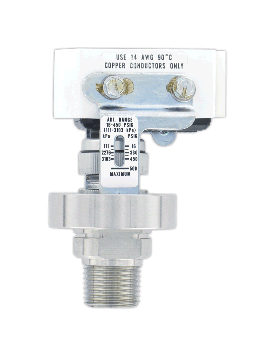 Pressure switch | range 16-450 psig (1.1-31.0 bar) | min. deadband 15 psig (1.0 bar) | max. deadband 50 psig (3.5 bar).