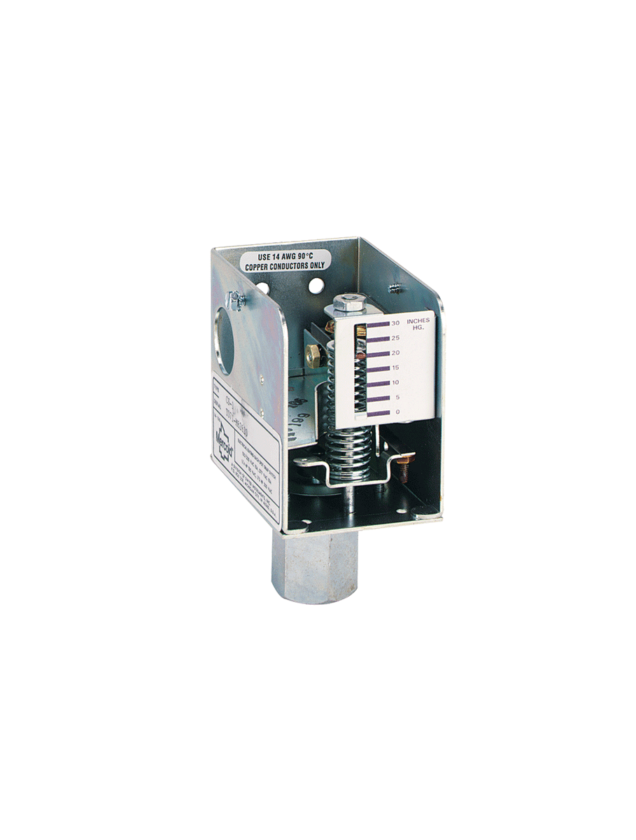 Low cost diaphragm pressure switch, adj. range 1-100" w.c. (.25-24.9 kPa), deadband 7" w.c. (1.74 kPa).