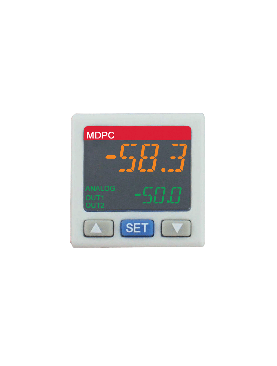 The Series MDPC Mini Digital Pressure Controller is a slim, gas pressure sensor that is small in size and light in weight. This pressure controller supports many installation methods and features high measurement accuracy. This small controller yields excellent stability, high shock and vibration resistance. The MDPC also provides good over-load capacity and heat resistance. It can be utilized in many industries such as: high-tech electronics, general processing, food packaging and automatic assembly. The MDPC features 6 user selectable pressure units and a large, LED 3-color display with selectable color options that allow for easy reading. Changing units is simple, and by using the included unit stickers, the pressure unit displayed becomes very clear. The fast parameter copy function makes copying parameters to other MDPC pressure controllers effortless. The key lock mode also prevents any unnecessary changes to the parameters, which can have an effect on the operation. Another characteristic of this multi-talented pressure controller is its ability to detect both positive and negative pressure. The MDPC is available in NPN, PNP, analog voltage or current output control modes.