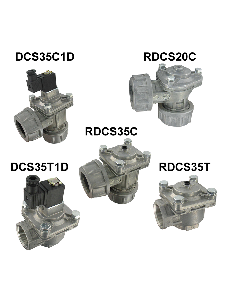 The Series DCS/RDCS Springless Dust Collection Valves are ideal for use with the Series DCT1000 and Series DCT500 duct collection timer boards. A springless design offers not only durability, but also reliability for an exceptional cleaning pulse. Both the Series DCS and RDCS have the option for either coupling or NPT connections. The coupling connection allows for a quick and simple installation. Only the stub pipe and blowtube need to be cleaned and deburred before the valve is fit into position. The “T° Series DCS has female threaded connections and the “C° Series DCS has a coupling connection. Both the “T° and “C° versions have a 90° angle between the inlet and outlet: the most suitable configuration for pulse valve applications. The valves are offered in both integrated and remote coil configurations.