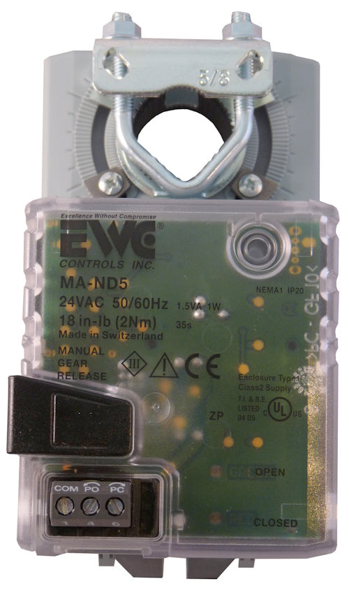 The NEW MA-ND5 motor actuators are easy to install, easy to wire up, and come with a 5 year warranty. The superior design insures long life and no maintenance. The UL Listed Motor Actuator is a 24vac 3 wire power open / power close type rated at 18“ lbs. of torque. The MA-ND5 motor features bright Green and Red LED's which correspond to the OPEN and CLOSED position of the blade. The motor also includes End-Stops for Min/Max position capability to allow adjustment of the design CFM flow into a particular zone or area. The MAND5 is a direct replacement for MA-ND3 or MA-ND4 actuators. The MA-ND5 will accept an Auxiliary Switch device (Model S1A), allowing control of Auxiliary functions such as equipment interlock or Fail-Safe circuits. The Motor can be oriented in any position in a conditioned area.