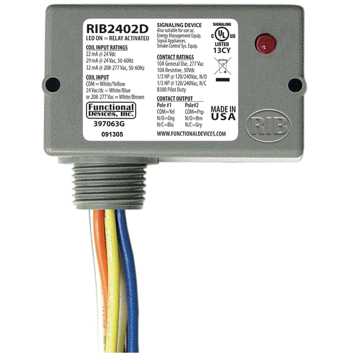 RIB2402D | Enclosed Relay 10Amp DPDT 24Vac/dc/208-277Vac | Functional Devices