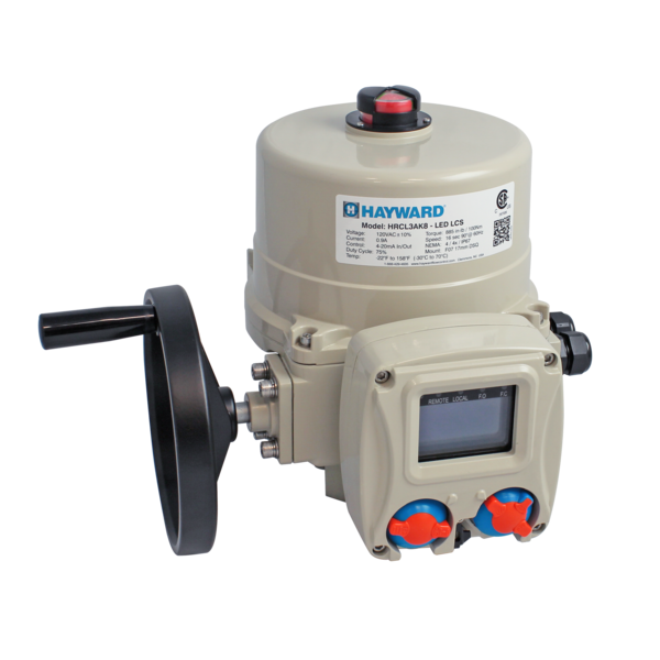 Hayward’s HRC Series electric actuators are designed and produced to provide years of service in demanding industrial environments such as chemical processing, waste and water treatment, power generation, oil & gas, marine, mining, and building services. The HRC Series incorporates Local Control System (LCS) functionality which allows for operator control of the actuator at the actuator. The LCS systems range from basic knob-type control to full-featured LCD submersible solutions. These quarter-turn units drive dampers, ball valves, butterfly valves, or inlet guide vanes that require torque ranges from 300 in-lbs up to 177,000 in-lbs. The HRC Series housings are designed to meet NEMA 4X environmental demands, with ISO5211 compliant mounting that readily attaches to most valves in the industries served. The HRC2 Series is a compact multi-stage gear train with a lever-less manual override system built in. The HRC3+ Series features an epicyclic transmission system that provides highly efficient multiplication of motor power to produce uniquely compact torque ranges compared to other technologies. A clutch-free manual override system provides full-time override capabilities during powered or un-powered events, and the LCS allows for simple adaptation for overhead chain-wheel drive installations.
