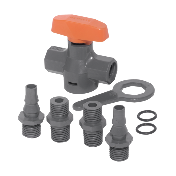 The Universal Stopcock™ features EPDM Seals and supplied with all the end connections necessary to make six different end combinations. Available in PVC material and in 1/4 in. size. Possible combinations of end connections are FPTxFPT, FPT x MPT, FPT x Hose, MPT x MPT, MPT x Hose and Hose x Hose.