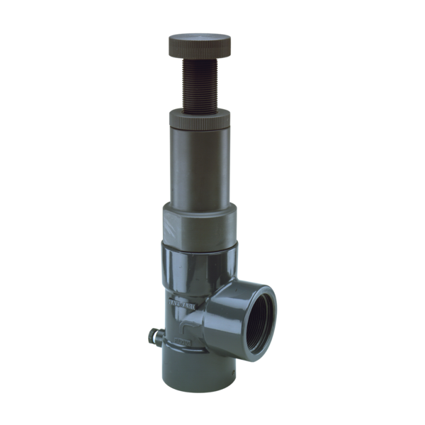 Piston style Pressure Relief ideal for high viscosity fluids. Available in size 1/2 in. to 2 in. PVC or CPVC, with threaded or flanged ends. Metric threads available upon request. Choice of FPM or EPDM Seals. Can be set from 5 to 75 psi.