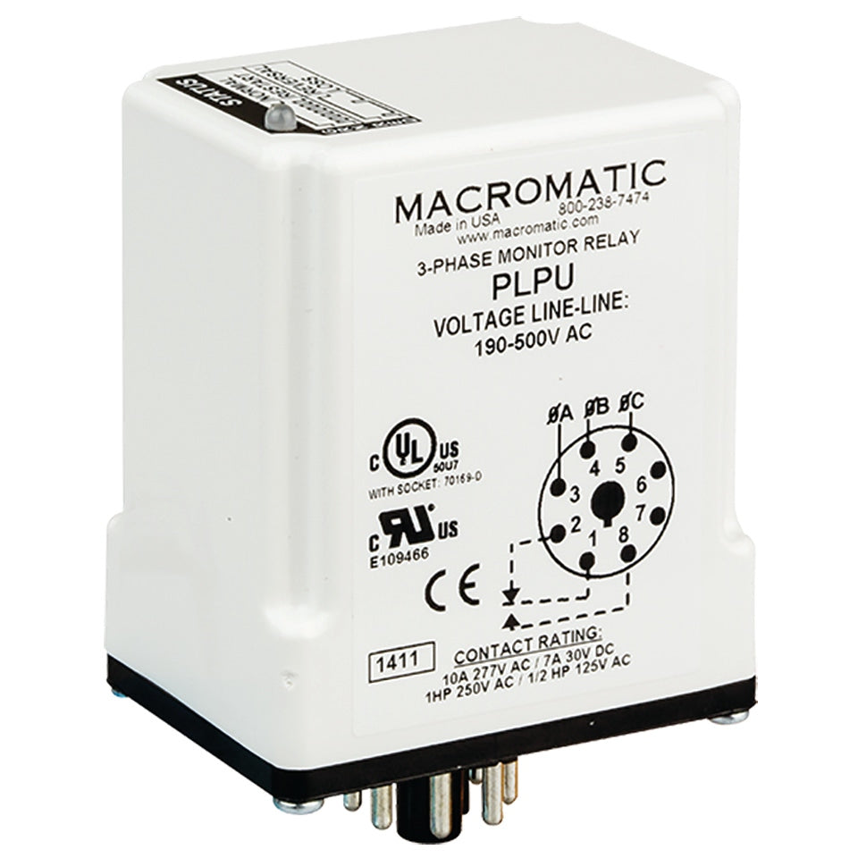 PLPU | 3-phase monitor relay | 190-500 VAC | 8 pin SPDT 10 amp relay | phase loss | phase reversal - fixed | Macromatic