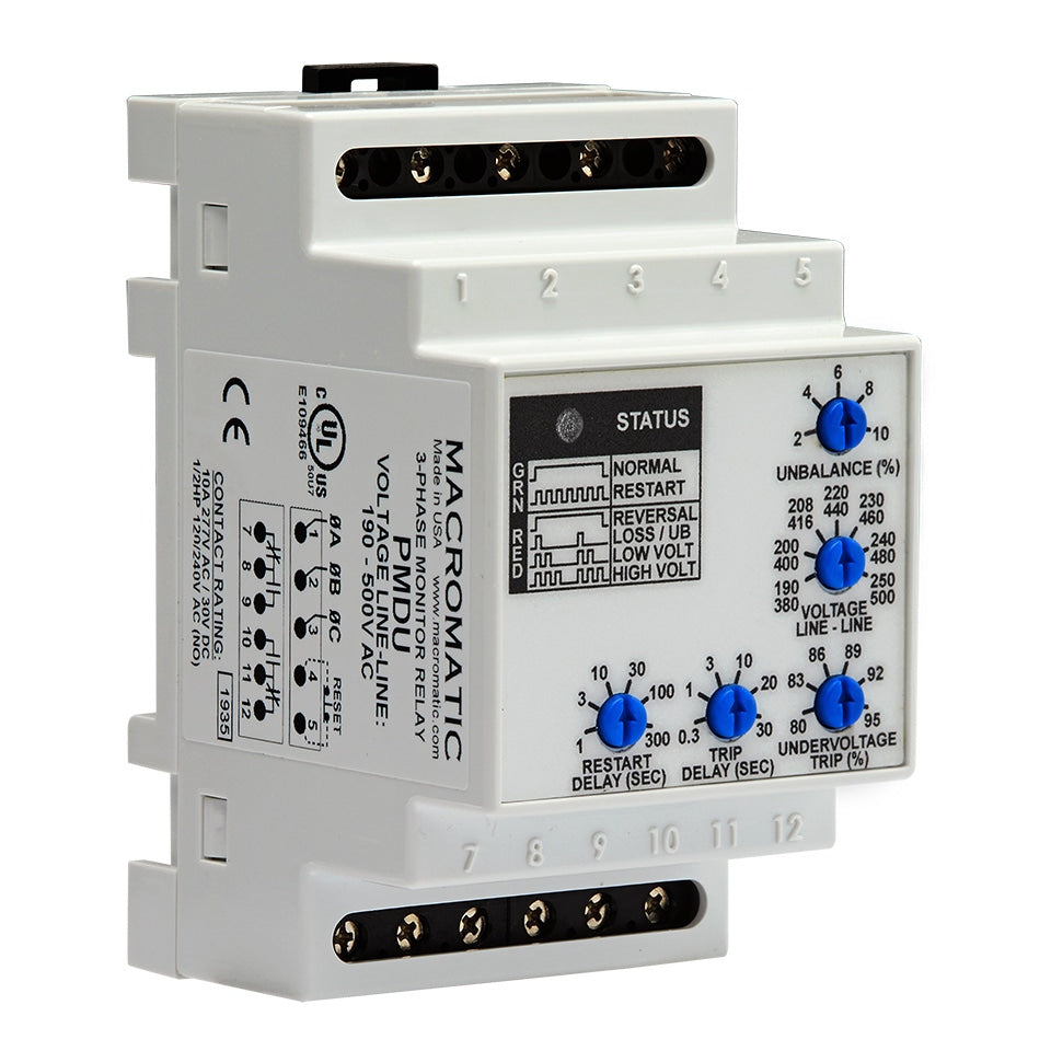 PMD120 | 3-phase monitor relay | 120 VAC | DIN Rail | 10 Amp DPDT relays | phase loss | reversal - fixed | unbalance | over/under voltage - adjustable | Macromatic