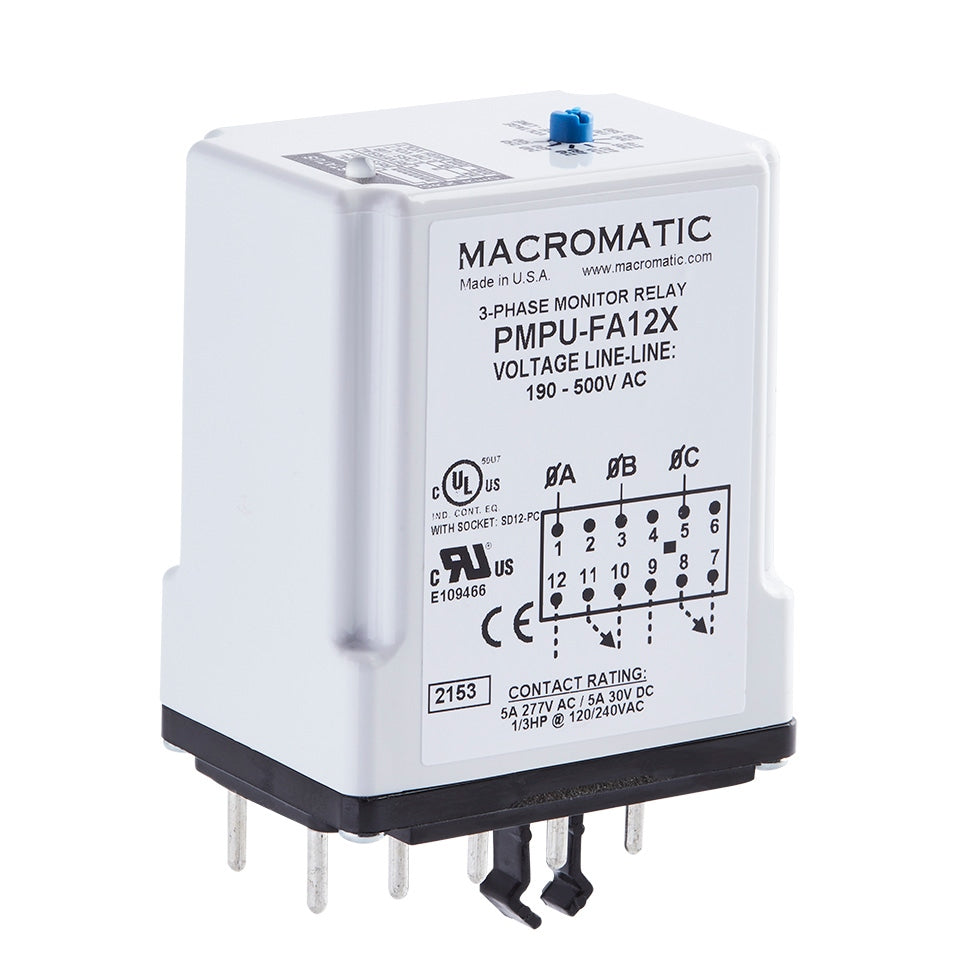 PMPU-FA12X | 3-Phase Monitor Relay | 12 Pin Plug-in | 190-500VAC | 5A DPDT | Loss/Reversal/Unbalance | Under/Overvoltage | Macromatic