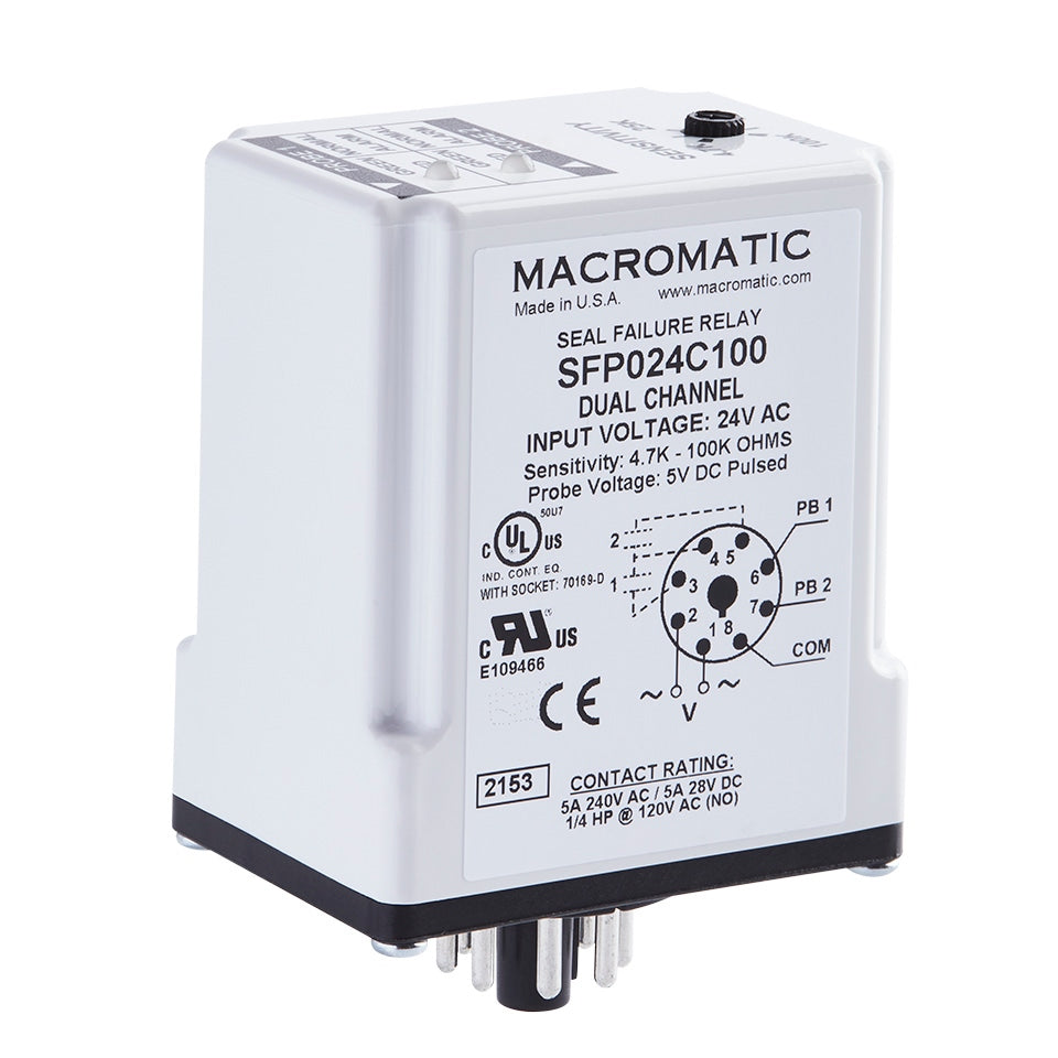 SFP024C100 | Seal Leak Relay | Dual Channel | 4.7-100K Ohms | 24V AC Input | (2) 5 Amp SPNO Relay | Plug-in | Macromatic