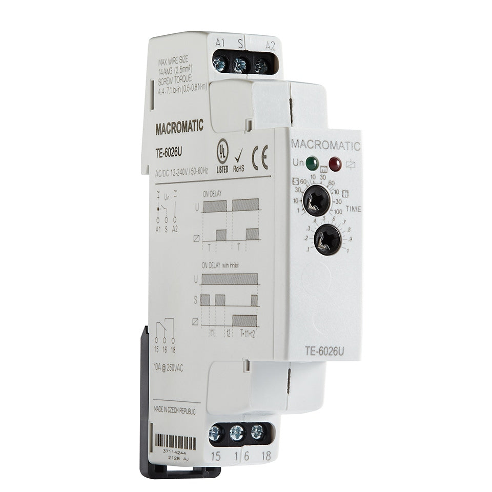 TE-6026U | Timer | ON Delay | 12-125V DC 24-24VAC | 15 amp SPDT | 0.1s - 100 hours | 17.5mm DIN Mount | Macromatic