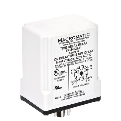 TR-56122-F | Delayed interval | 240V AC | 10A DPDT | 0.05 - 5 seconds | Fixed (add product to cart to specify time) | Plug-in | Analog | Macromatic
