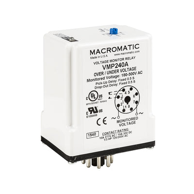 VMP240AX | Voltage monitor relay for 240 VAC | 10 Amp relay | DPDT | Adj Pick up | Fixed Drop out and trip delay | plug-in | 5A DPDT | Macromatic