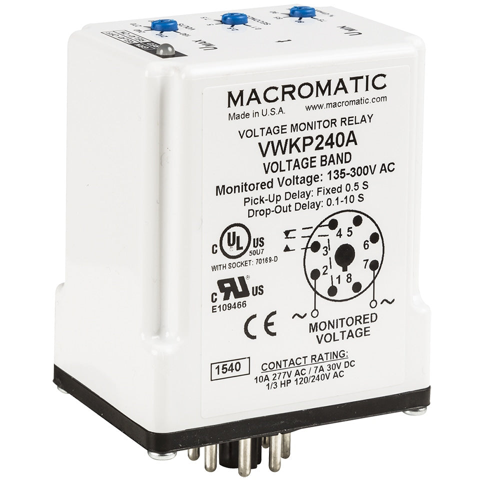 VWKP480A | Voltage band relay for 480 VAC | 10 Amp relay | DPDT | Adj Pick up and Drop out | Adj dropout delay 0.1-10 seconds | plug-in | Macromatic