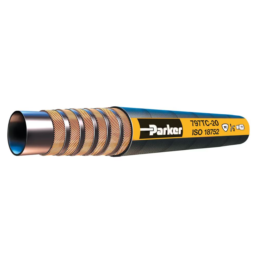 Parker’s 797 hose, within the GlobalCore product line, was designed to deliver consistency and reliability with a constant working pressure of 6,000 PSI in all sizes. The 797 hose is made with Compact Spiral technology making it light, durable, and easily bent making installation easier and quicker. The 797 hose is designed, built and tested to the ISO 18752 performance specifications. Sizes range from ¼” to 2” in diameter with different cover options available for various markets.