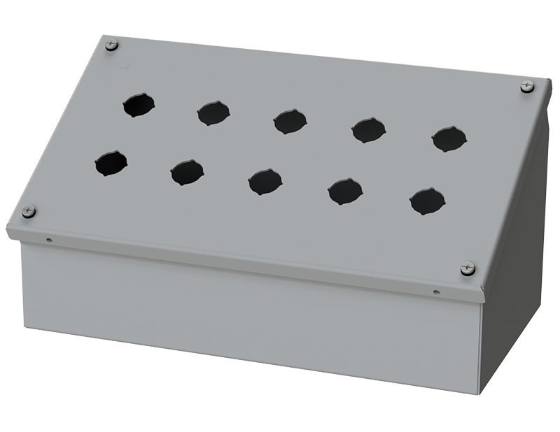 Designed to offer protection for all standard brands of oil-tight pushbuttons, switches, and pilot lights where slanted surfaces are desired. It offers protection from dust, dirt, oil and water.