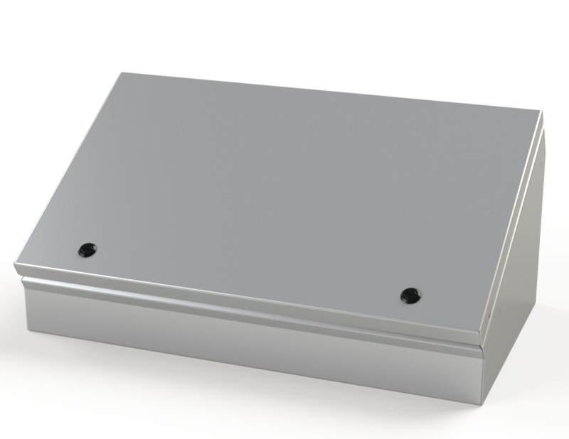 Designed to house electrical and electronic controls, instruments, and components. Provides protection from dust, dirt, oil and water. Consolets can be mounted on either of two sides to give a control surface inclined 30 degrees or 60 degrees. Can be mounted on desks, machines, or pedestals (not included).