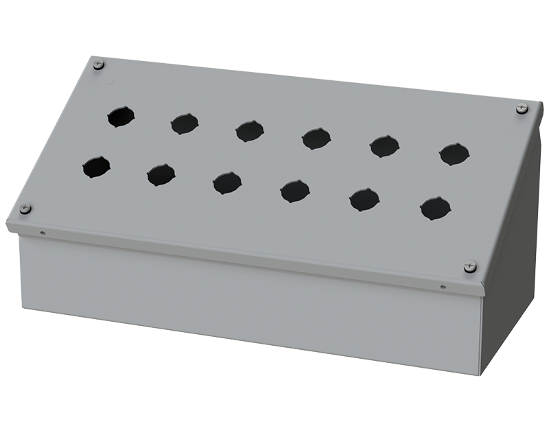Designed to offer protection for all standard brands of oil-tight pushbuttons, switches, and pilot lights where slanted surfaces are desired. It offers protection from dust, dirt, oil and water.
