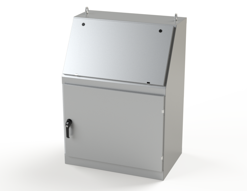 Designed for electronic controls and instruments. Equipment can be mounted on the sloping control panel door. Interior components mount to stationary panels. Heavy duty construction provides protection from dirt, oil, dust, and water.