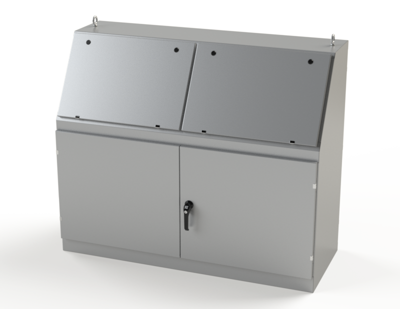 Designed for electronic controls and instruments. Equipment can be mounted on the sloping control panel door. Interior components mount to stationary panels. Heavy duty construction provides protection from dirt, oil, dust, and water.