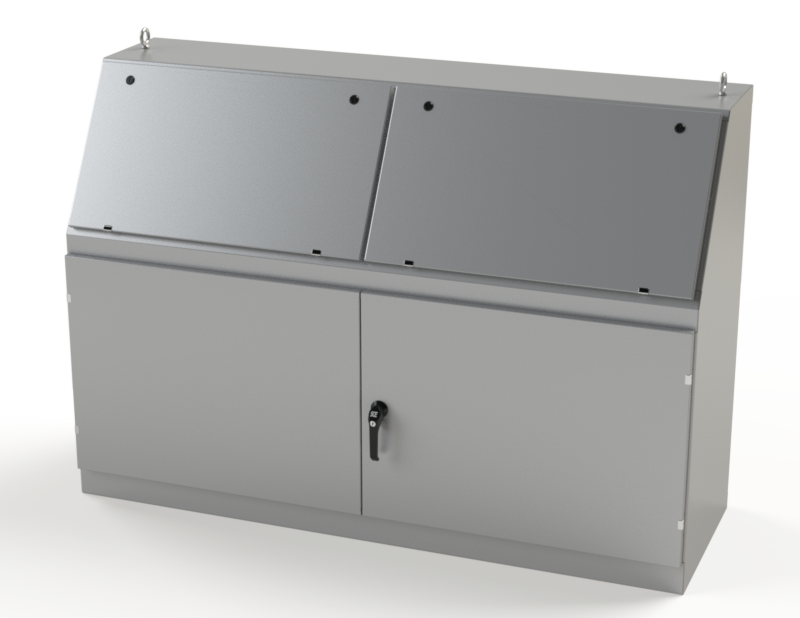 Designed for electronic controls and instruments. Equipment can be mounted on the sloping control panel door. Interior components mount to stationary panels. Heavy duty construction provides protection from dirt, oil, dust, and water.